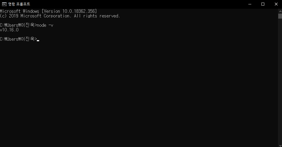 그러면 기본 창이 나오는데 여기서 node (띄우고) -v를 누르시면 현재 설치한 버전이 뜹니다.