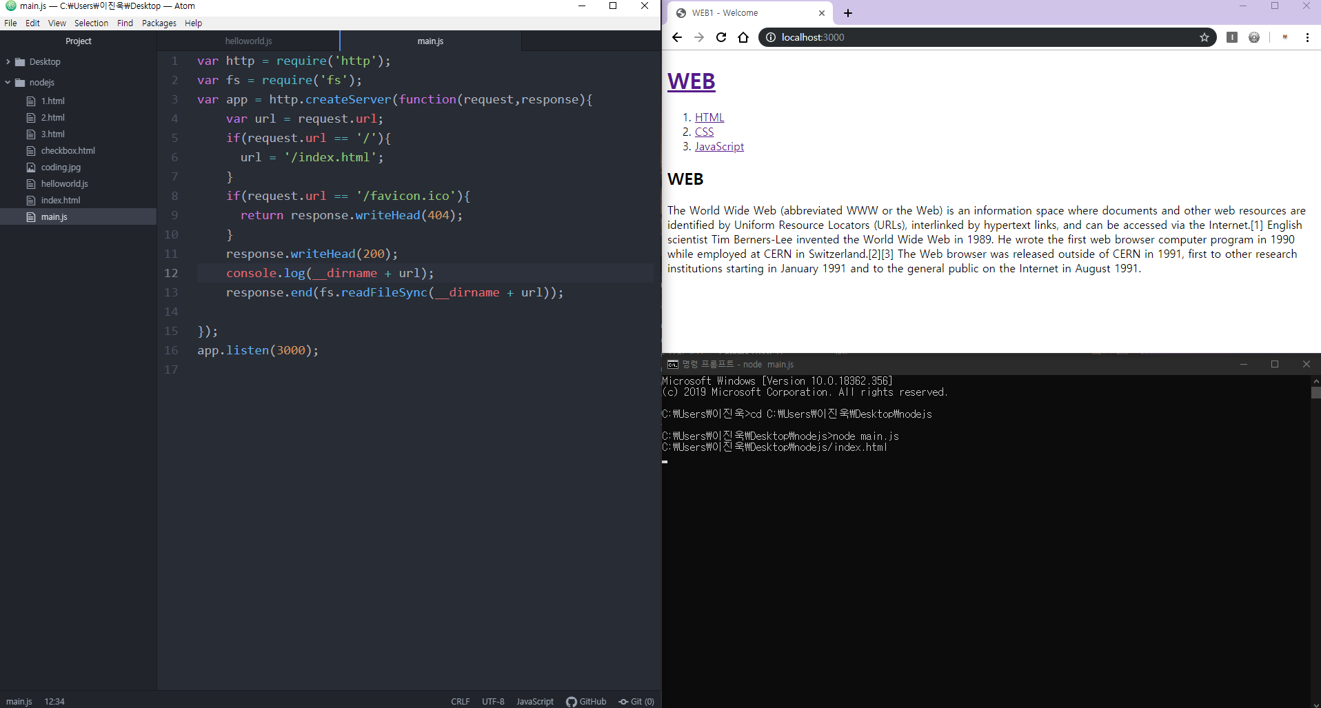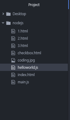 이제 atom에서 node.js폴더 안에 main.js라는 새 파일을 하나 만들어 줍시다.